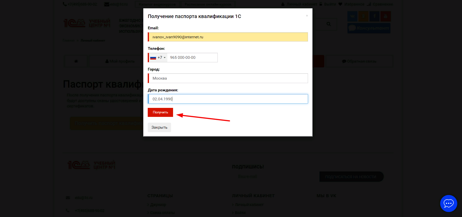 Далее, в окне «Получение паспорта квалификации 1С» необходимо заполнить личную информацию и нажать на кнопку Получить